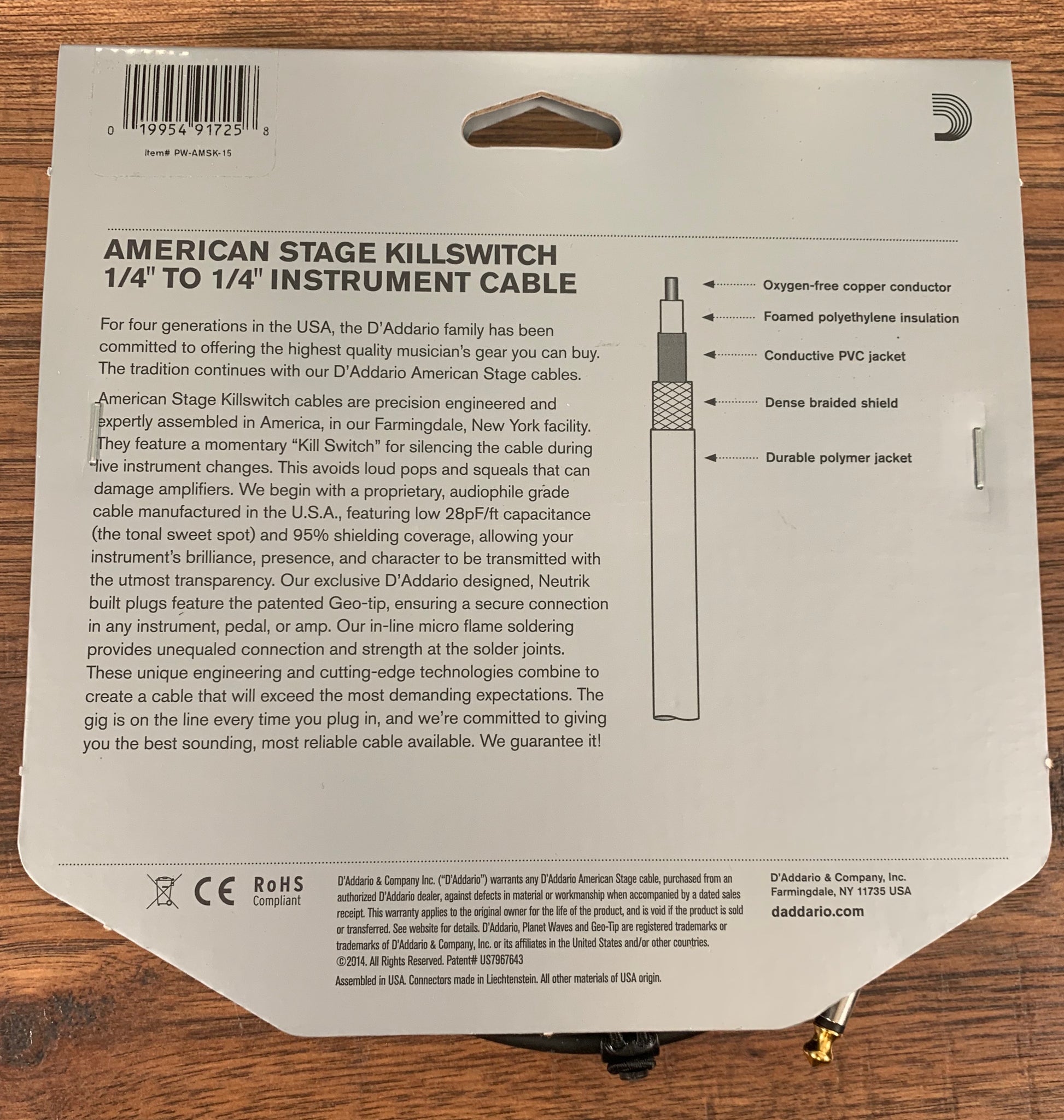 D'Addario American Stage Series cables are designed to reproduce the natural tones of your instrument with zero interference. With audiophile quality wire, which is made in the USA, the low 28pF/ft capacitance is the sweet-spot for uncolored tone and the 22AWG oxygen-free copper conductor provides exceptional signal transfer. Full coverage comes from using 95% tinned copper braiding, eliminating handling noise and rejecting interference. Using only the finest materials, custom designs and precision USA manufacturing methods, American Stage delivers a professional performance cable. The result is pure, natural tone guaranteed for life.