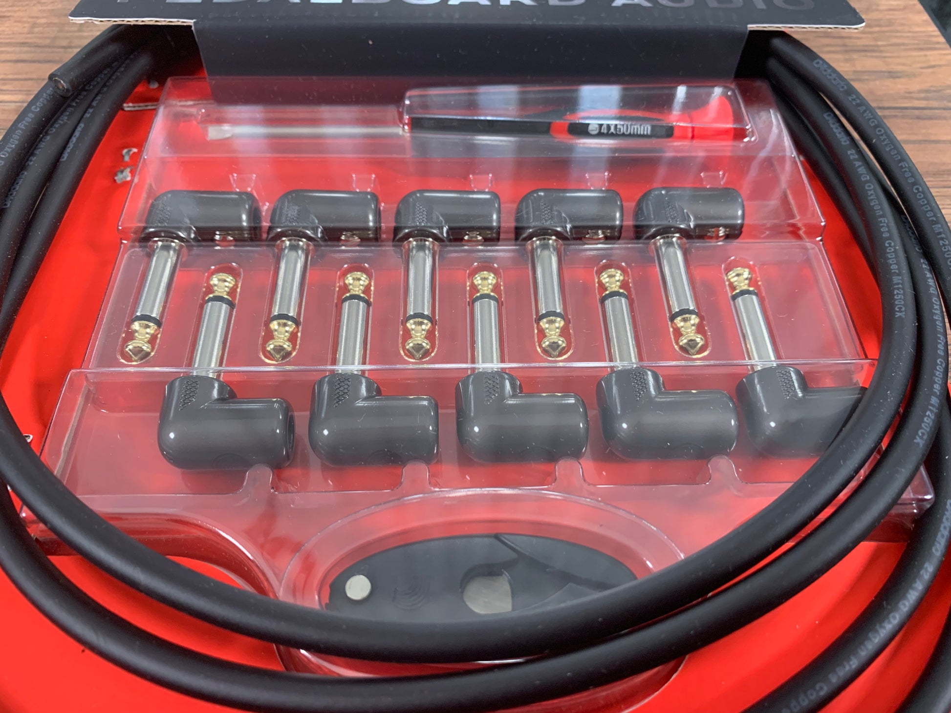 Custom cut cable to suit your pedal board's layout. The plugs and cables in this kit are specially designed for quick and reliable assembly, simply cut, twist and screw and you're done. Includes 10 feet of cable, 10 right-angle plugs and a mini cable cutter.