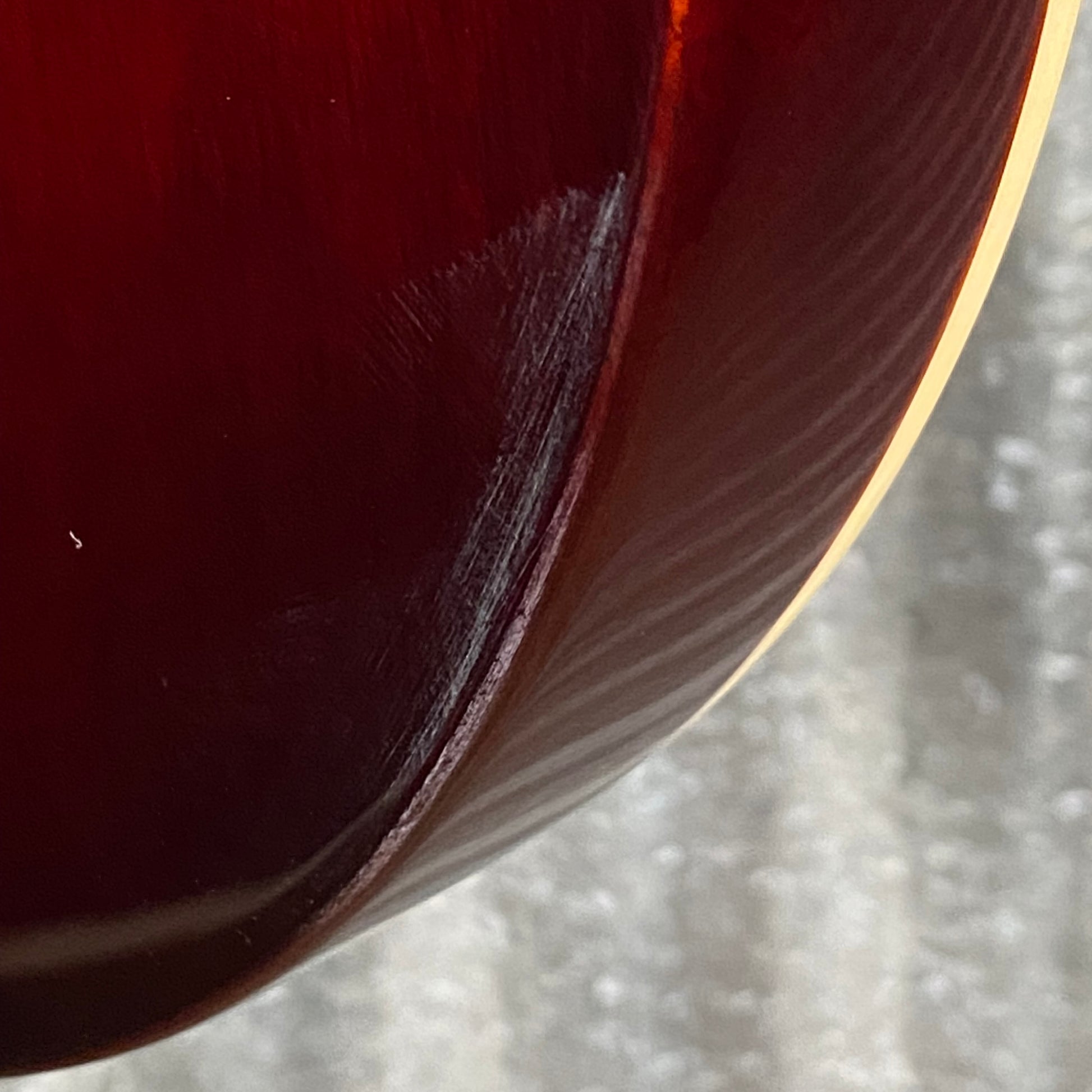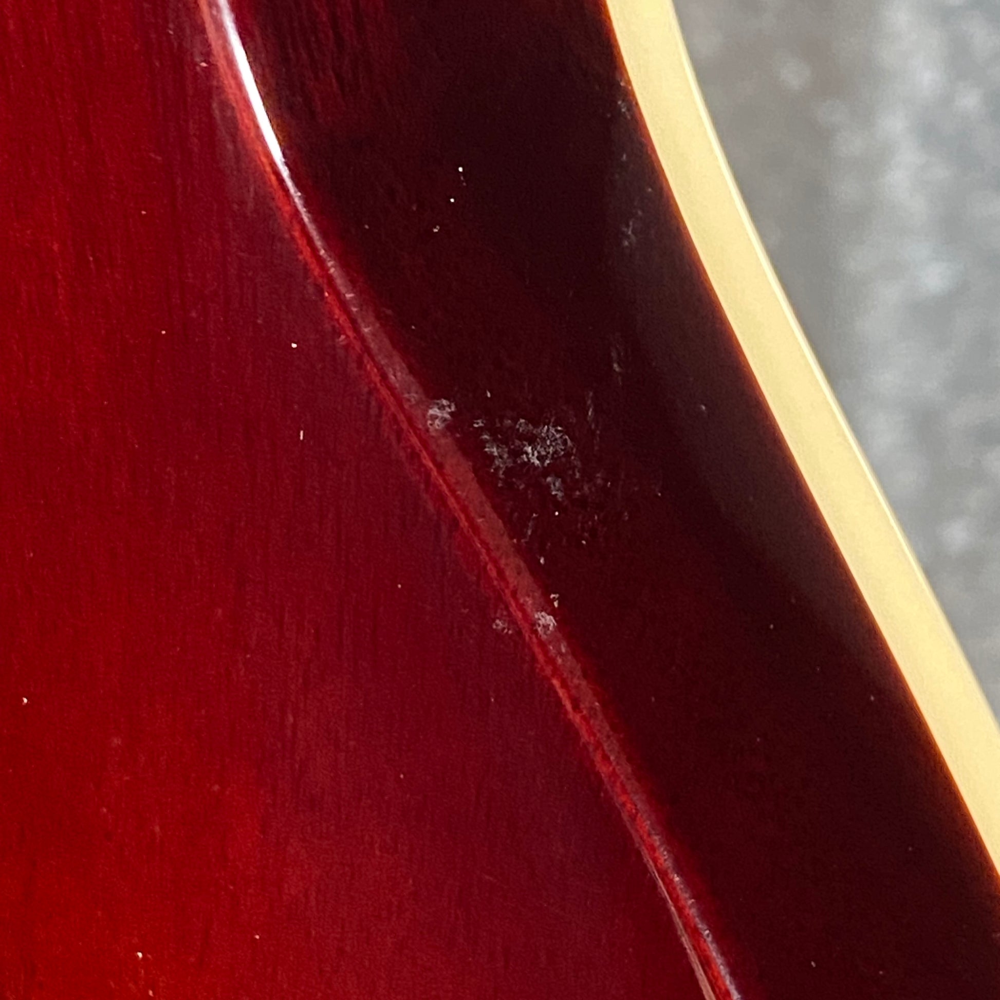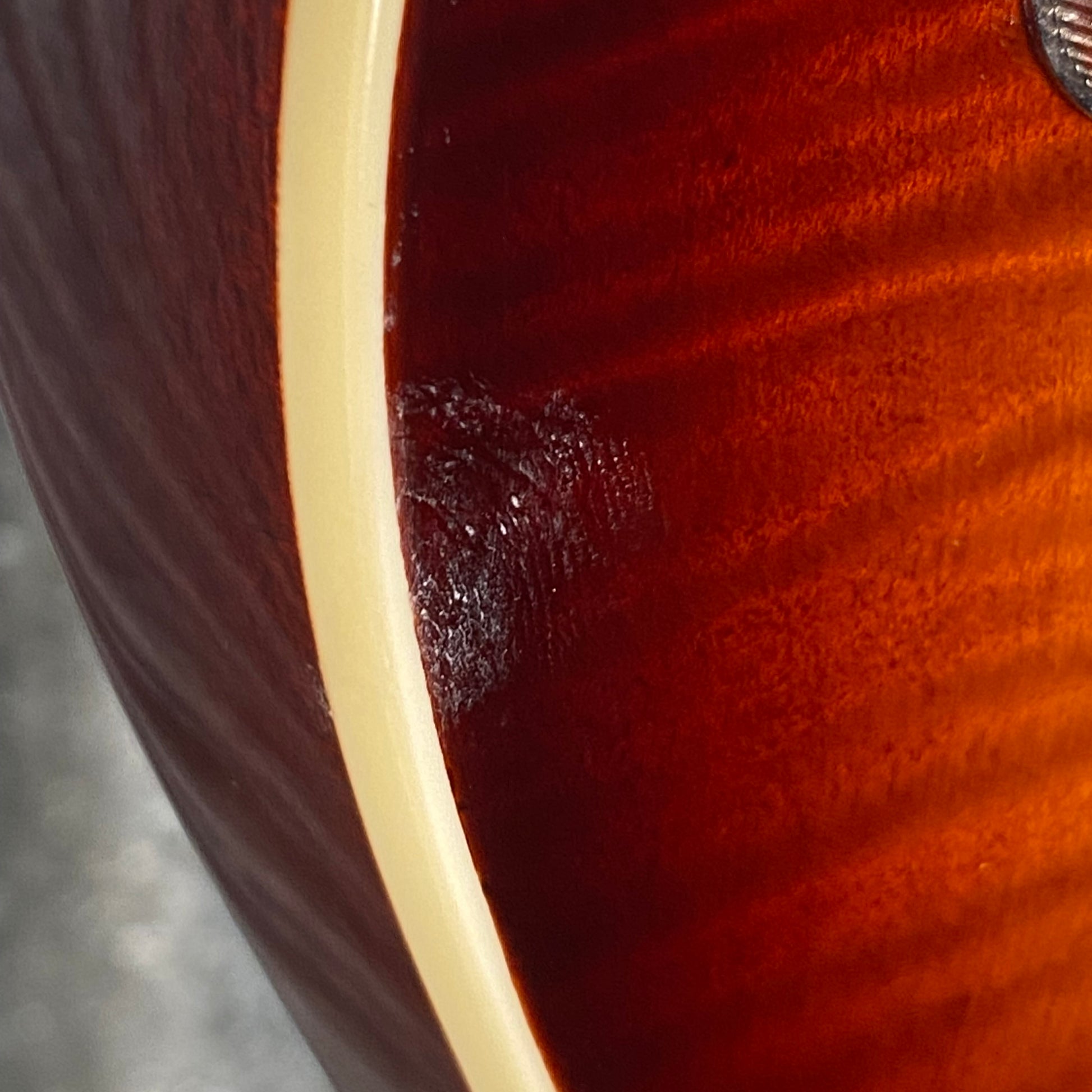 Front left side of the body has blemishes under the clear finish. Back right side of the body also has some blemishes under the clear finish.