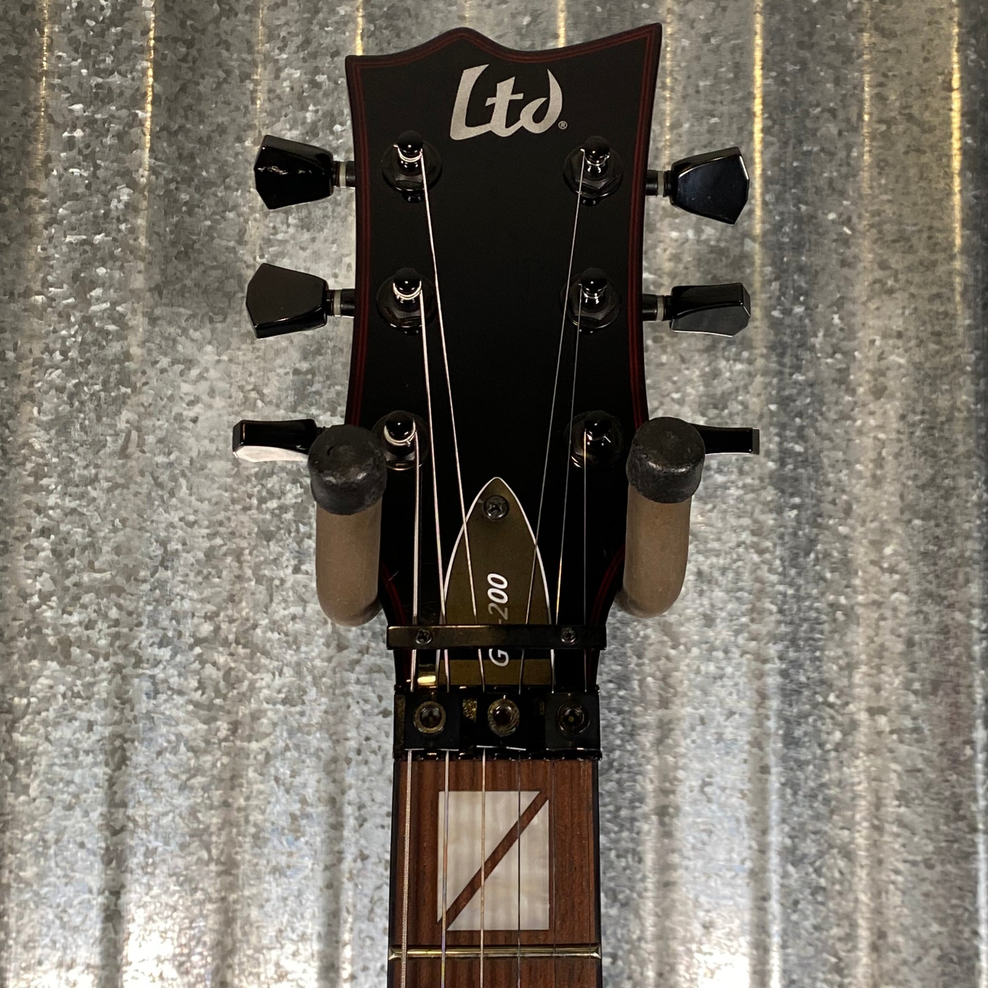 The LTD GH-200 represents the most affordable model in the Gary Holt Signature Series, but it packs a mean punch. It includes bolt-on construction, with a comfortable basswood body and a thin U-shaped maple neck, with a roasted jatoba fingerboard that gives you Gary's split rectangle inlay design and 22 extra-jumbo frets. The GH-200 also offers an ESP Designed LH-301 pickup set with red covers, a Floyd Rose Special bridge for your most outrageous leads, and red binding on the body and headstock to complete its menacing vibe. Available in Black finish.