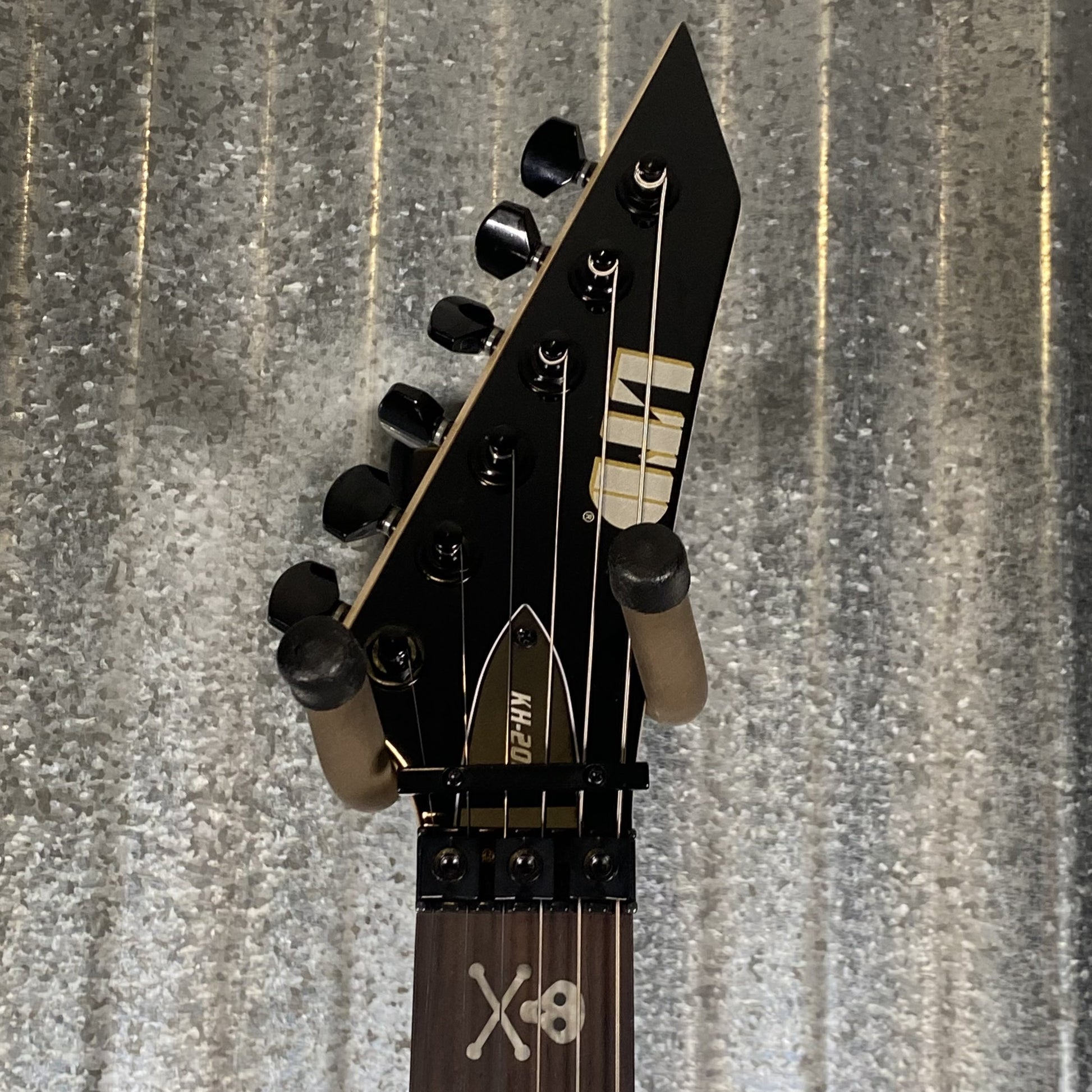 The ESP LTD KH-202 Kirk Hammett Signature Electric Guitar delivers the vibe and playability of Kirk's personal ESP guitar at a price we can all appreciate. 25-1/2'-scale maple neck, basswood body, ESP LH-301 pickup set, double-locking Floyd Rose bridge, extra-jumbo frets, and skull-and-bones inlays on the rosewood fretboard. Black hardware and black finish.