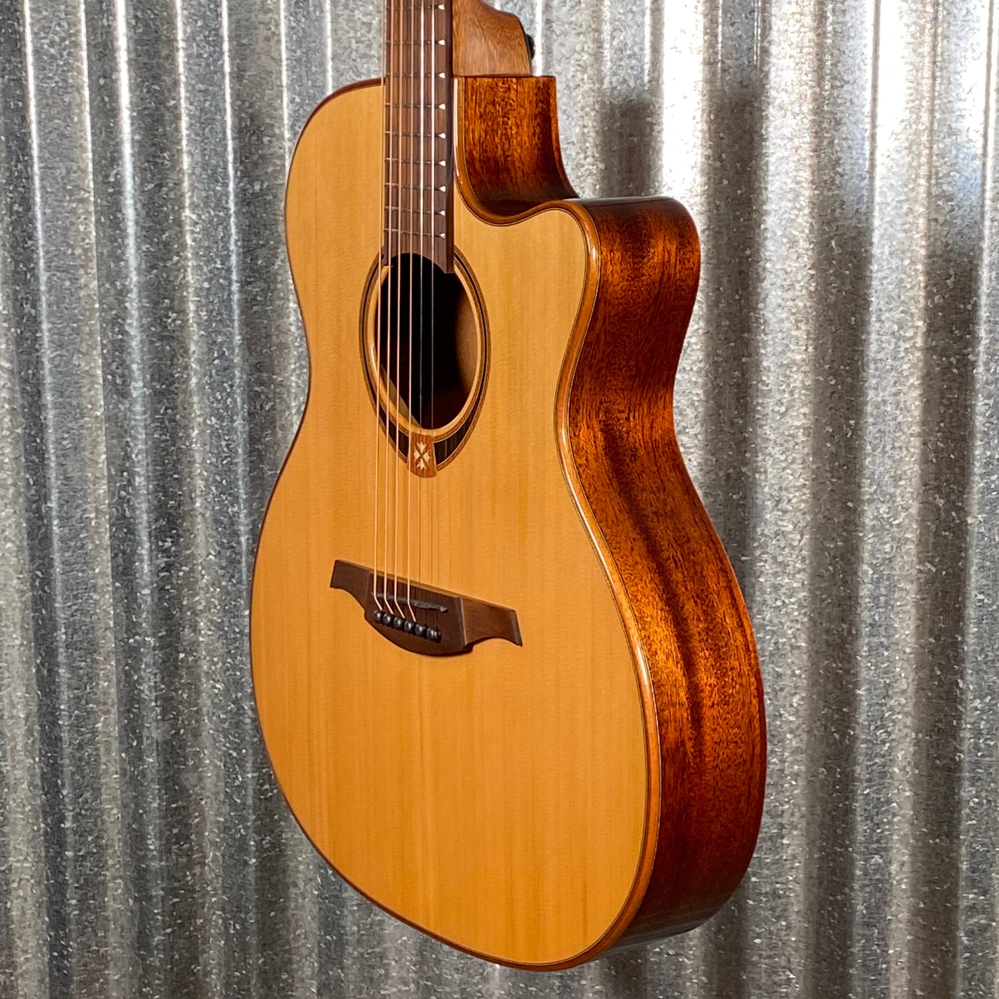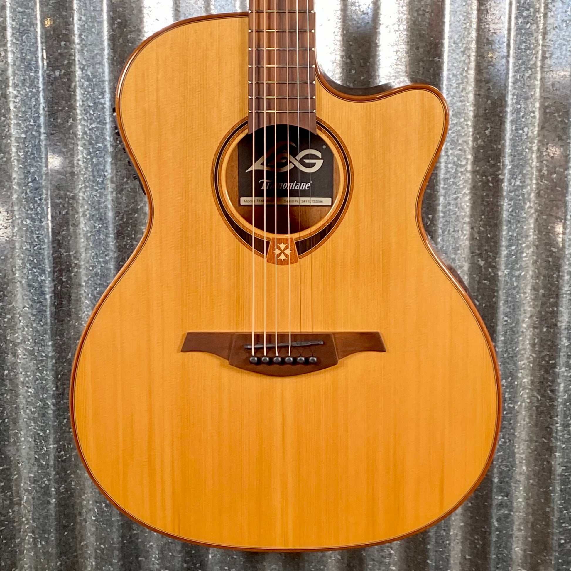 Lag T118ASCE Featuring an auditorium slimline cutaway shape, the Lag T118ASCE provides a balanced sound and comfortable playing experience. Ideal for those who prefer a smaller body without sacrificing sound quality, the solid Red Cedar top, Khaya back and sides, and glossy varnish finish all contribute to its refined look.
