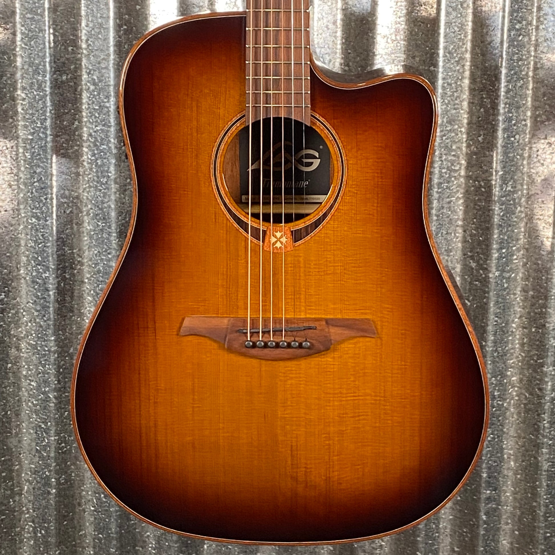 Lag T118DCE-BRS Dreadnought Cutaway Electro-Acoustic Guitar Featuring a beautiful dreadnought cutaway body shape, the T118DCE-BRS guarantees a bold and resonant sound. The unique Brown Shadow finish on the solid Red Cedar top, along with Khaya back and sides, adds a touch of warmth to the aesthetic, while the glossy varnish finish adds luster. Electronics Equipped with the AstroLag preamp, the T118DCE-BRS provides comprehensive control over Volume, Low, Middle, High, Brilliance, Notch, and Phase. A built-in tuner makes tuning effortless, allowing you to focus on the music. Premium Features The T118DCE-BRS showcases Lag's commitment to quality, from the black graphite nut, saddle, and bridge pins that complement the black die-cast machine heads, to the BrankoWood headstock, bridge, and fingerboard. The quarter-round body bindings add to the charm and also enhance the playing comfort, making the T118DCE-BRS a pleasure to play for musicians of all levels.