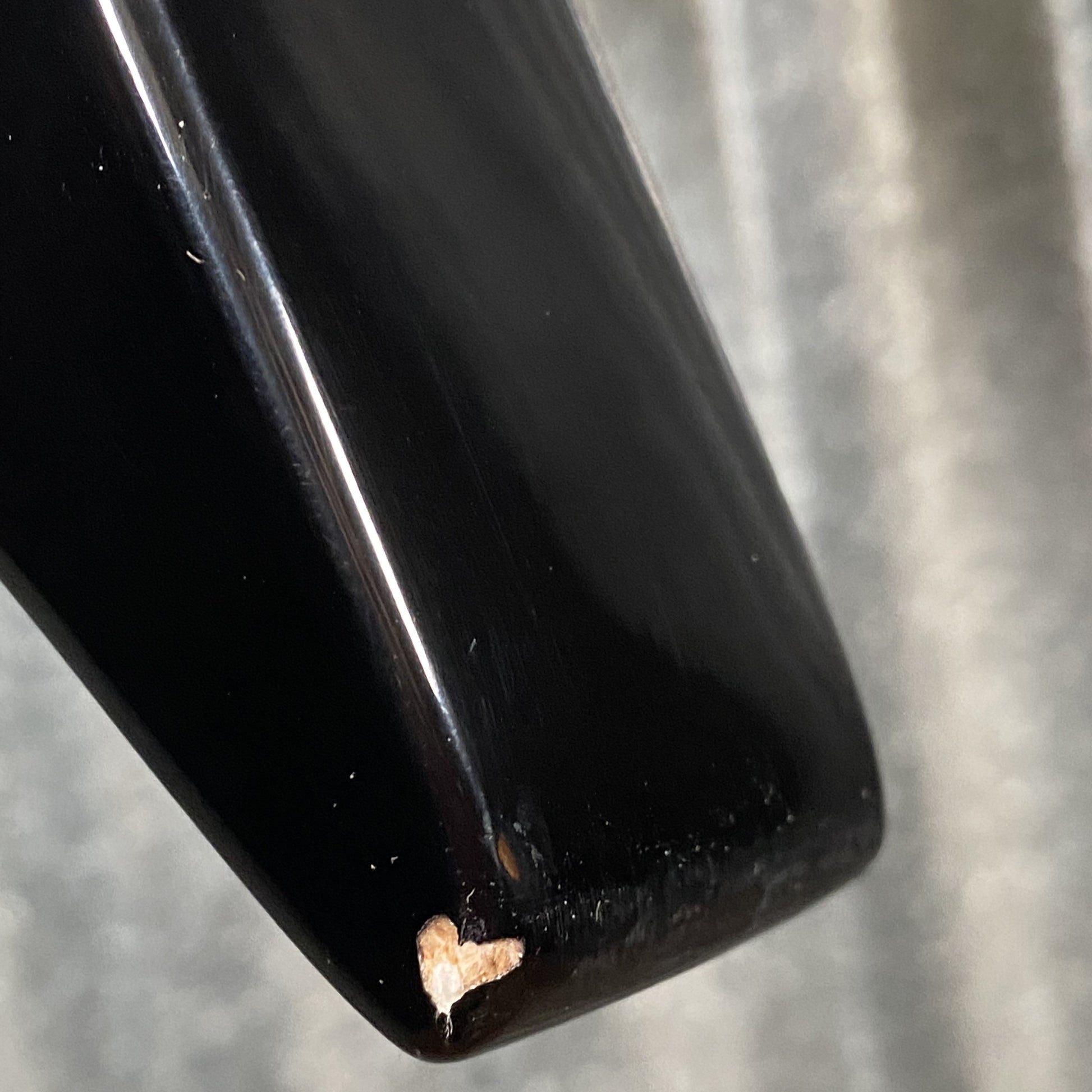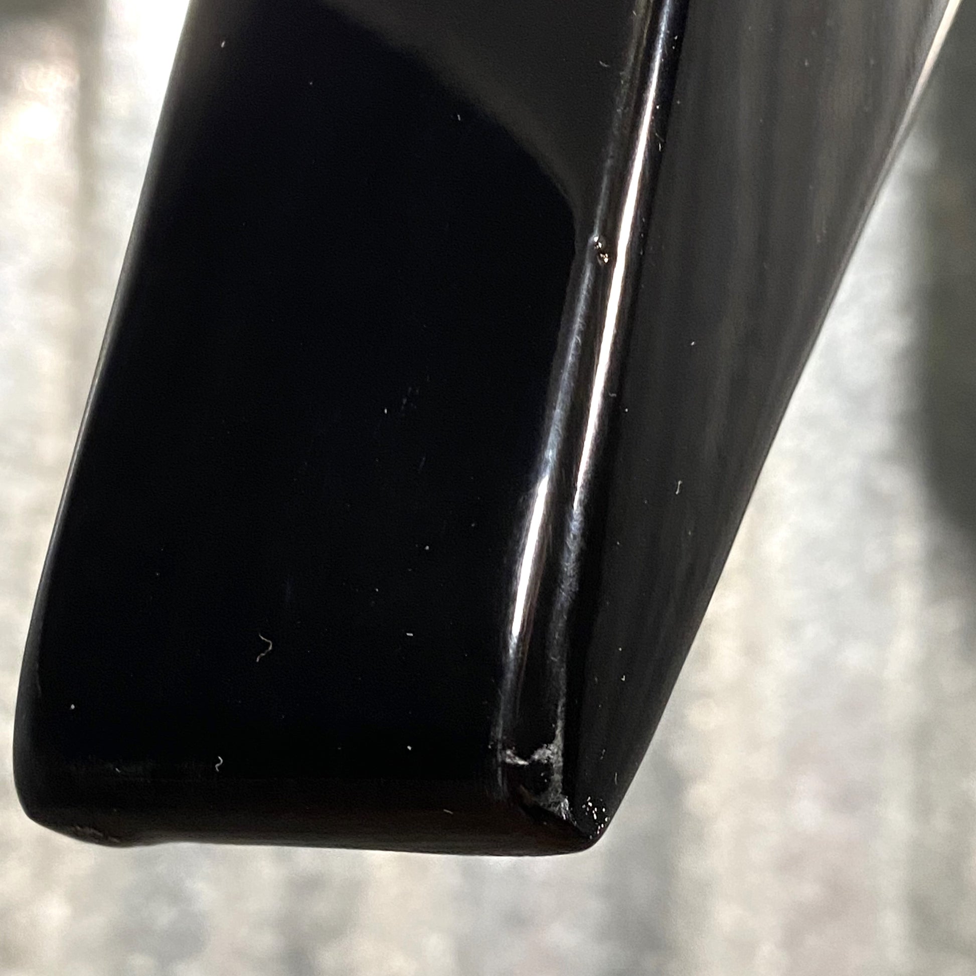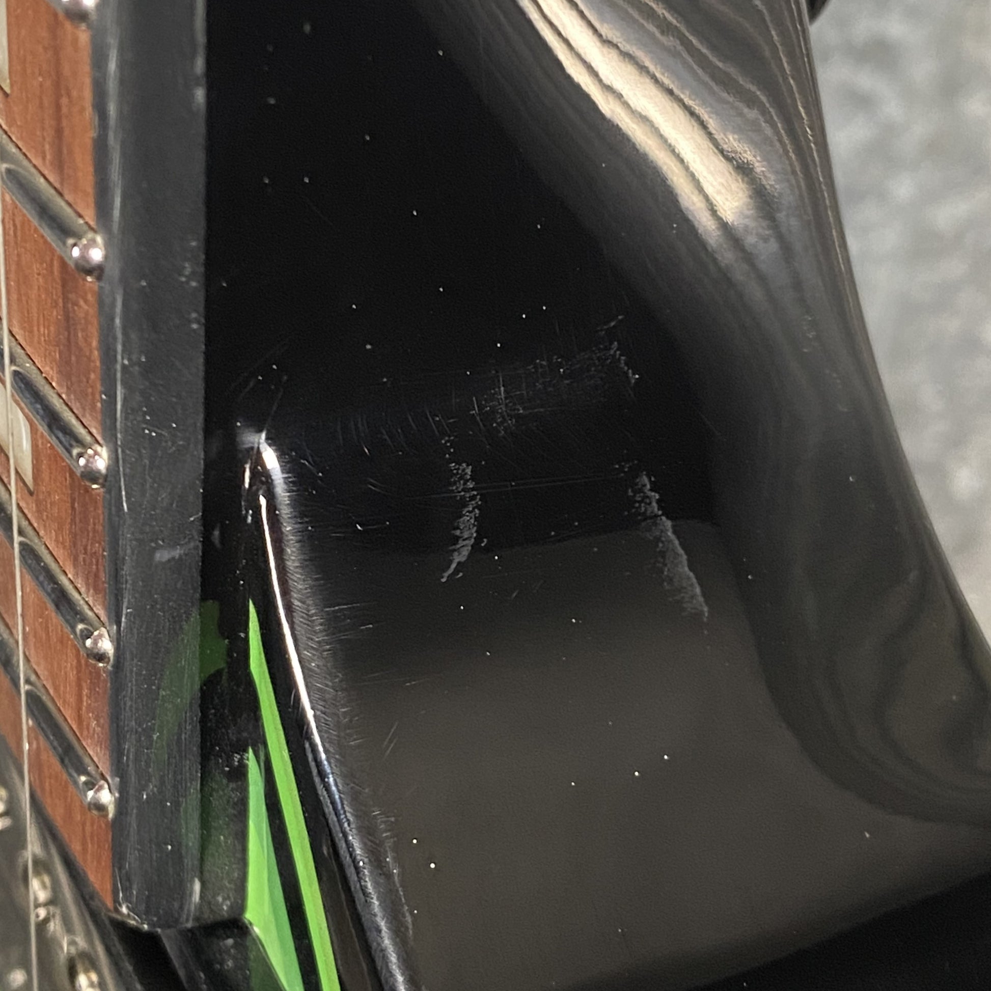 Top right curve of the body has some scuff marks. Both left & right points of fins have scuffing, and a finish chip.